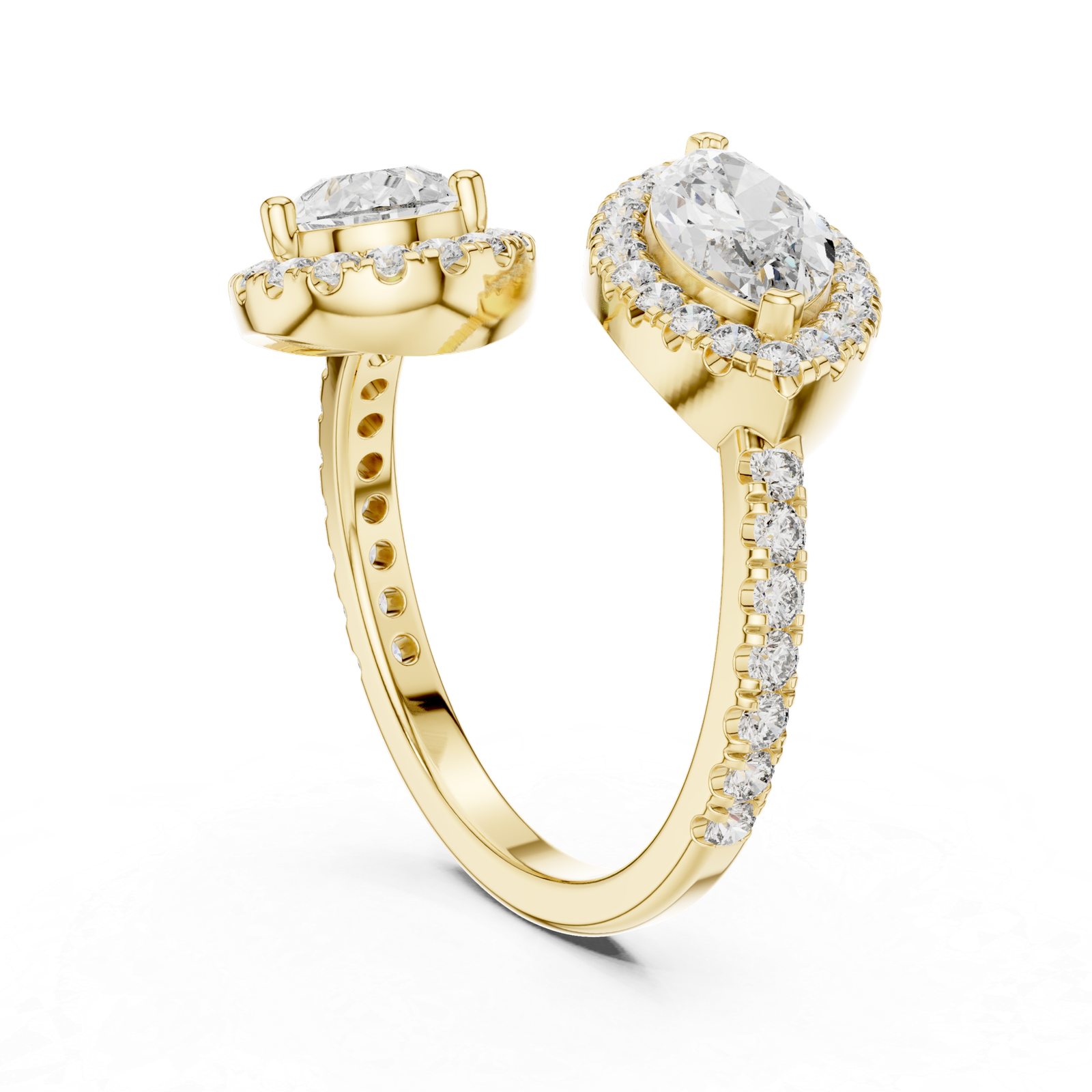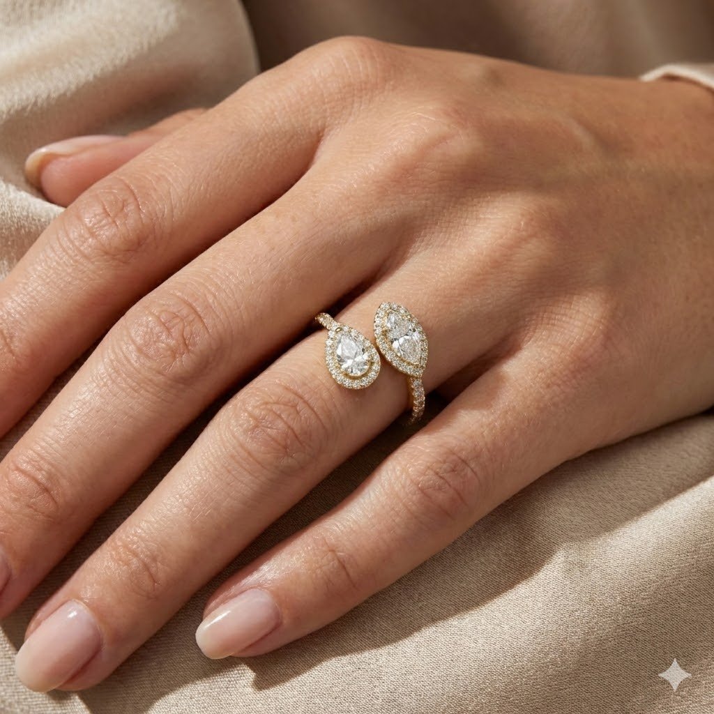 Discover the unparalleled beauty of our uniquely designed ring featuring two stunning pear-shaped solitaire diamonds accompanied by multiple loose diamonds. This exquisite piece is thoughtfully crafted to elevate your style while adding a touch of sophistication to your jewelry collection. The open-top design creates an original look, ensuring you stand out on every occasion.