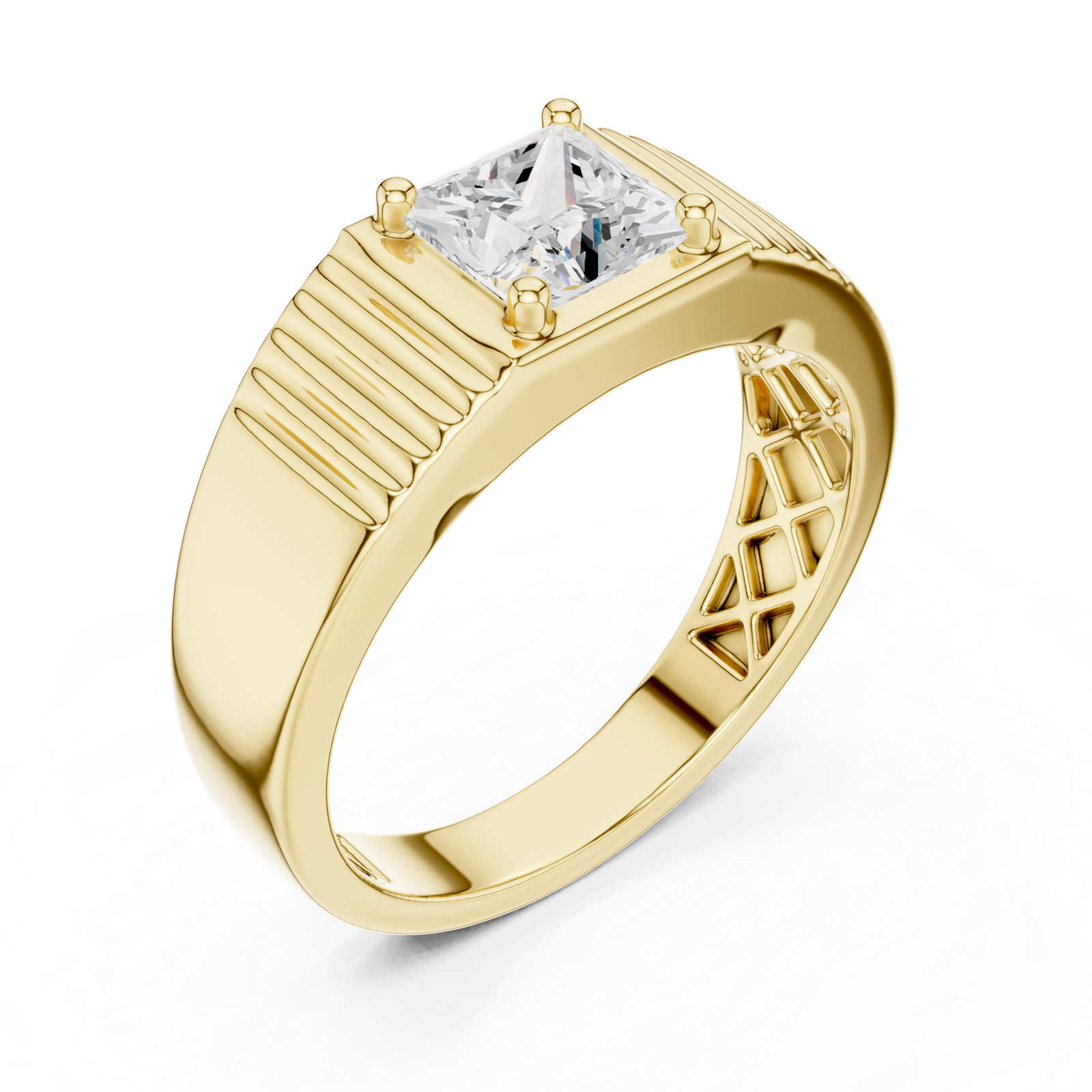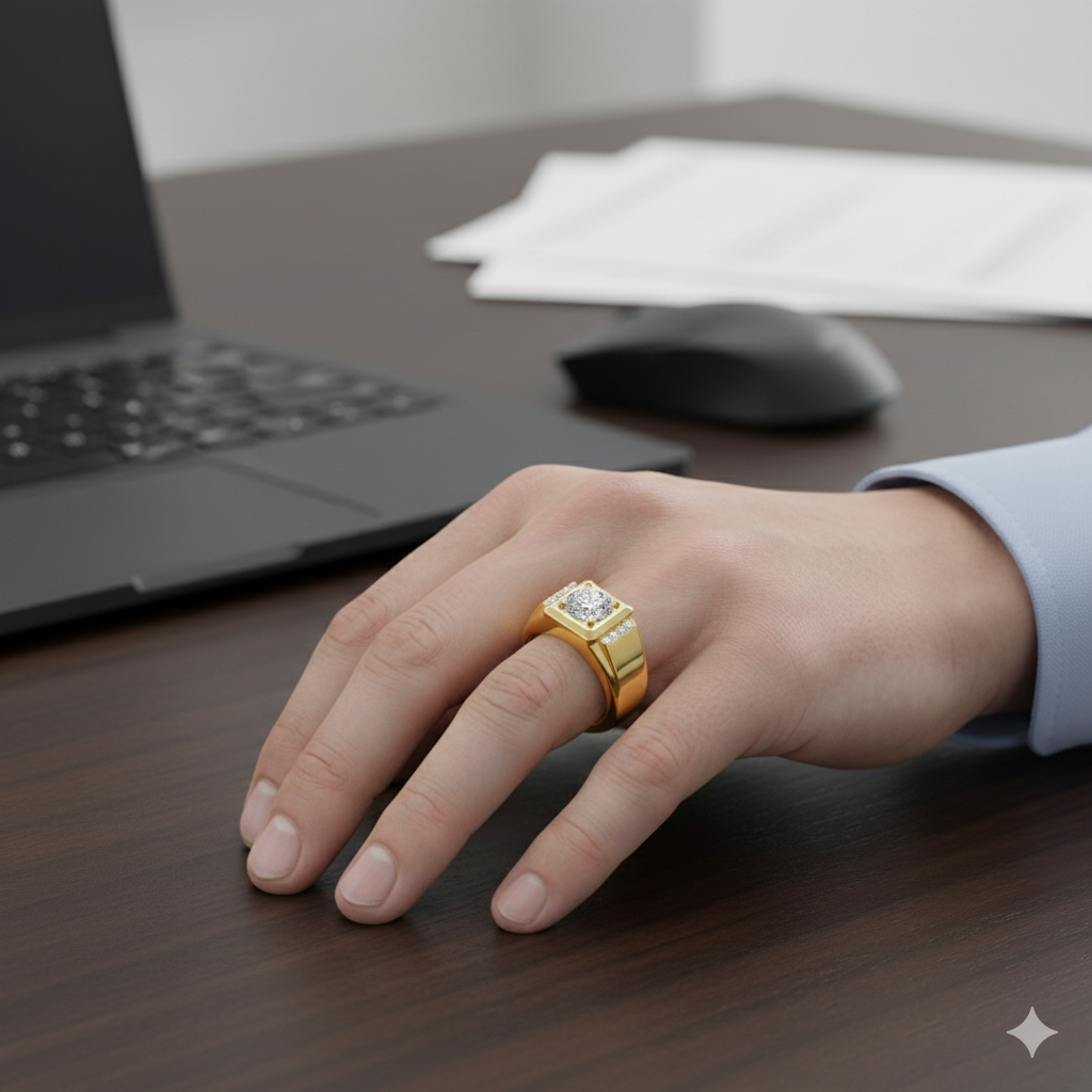 Complementing the central diamond is an array of meticulously placed smaller diamonds, creating a luminous halo effect. These surrounding diamonds enhance the central piece with their clarity and shine, delivering maximum sparkle from every angle. The interplay between the centerpiece and its supporting diamonds ensures a visually captivating design that exudes class and sophistication. Perfect for engagements, anniversaries, or a special gift, this ring symbolizes eternal love and commitment.
